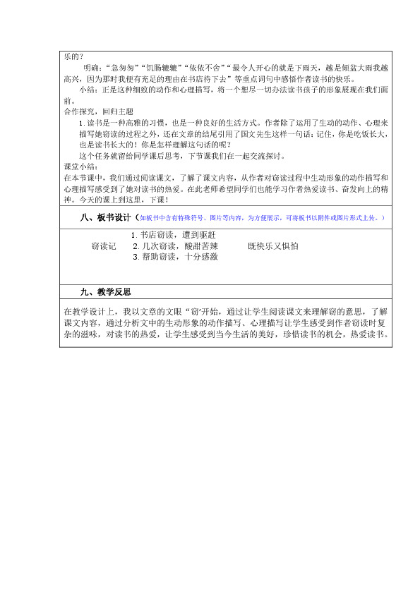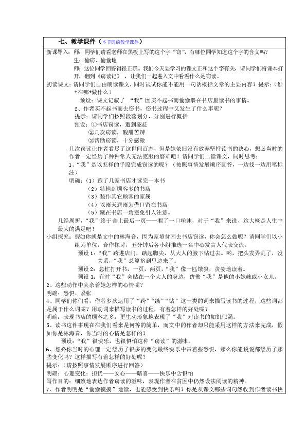 在教学设计上,我以文章的文某某“窃’开始,通过让学生阅读课文来理解窃的意思,了解课文内容,通过分析文中的生动形象的动作描写、心理描写让学生感受到作者窃读时复杂的滋味,对读书的热爱,让学生感受到当今生活的美好,珍惜读书的机会,热爱读书。
