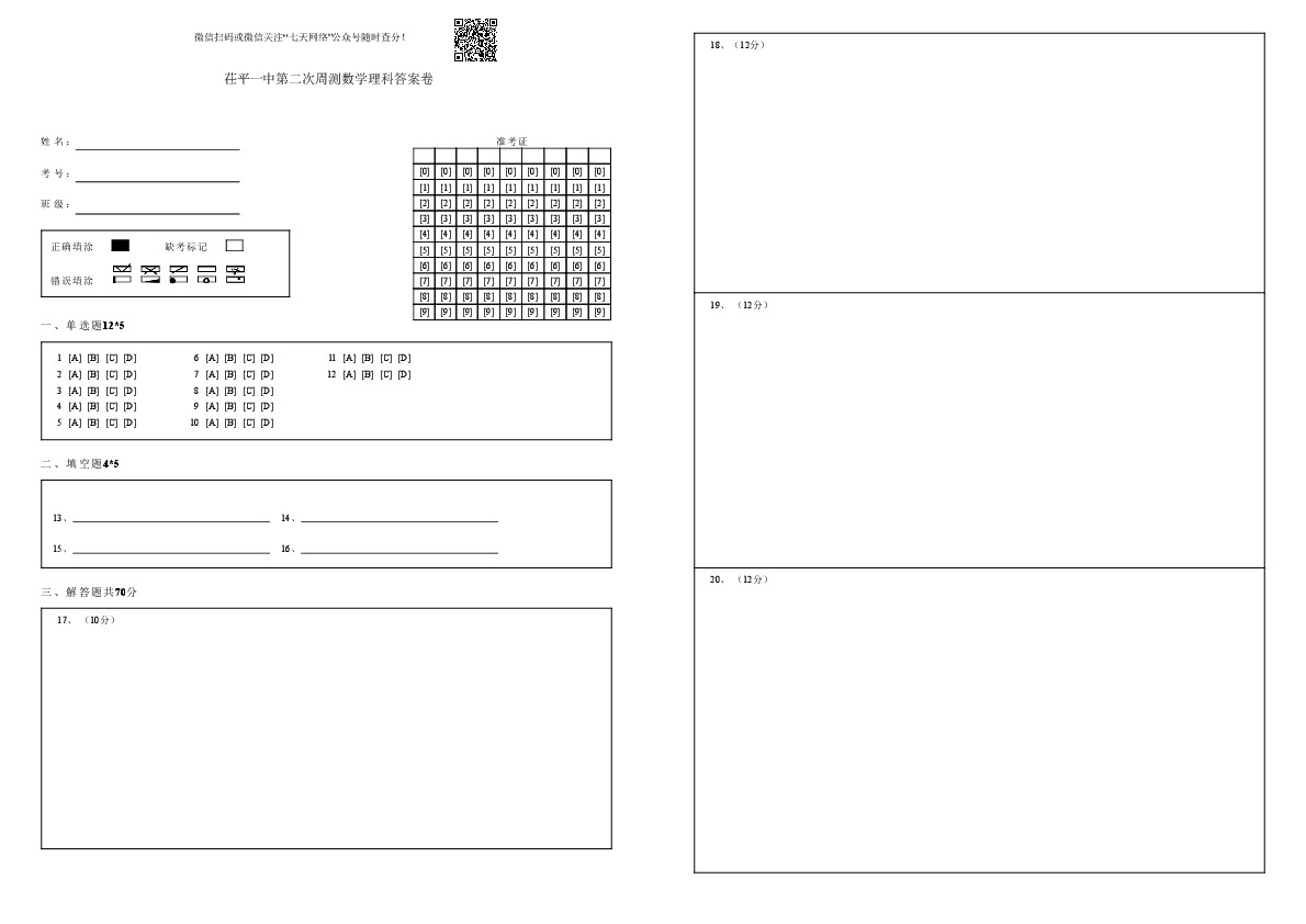 微信扫码或微信关注“七天网络”公众号随时查分! 茌平一中第二次周测数学理科答案卷 姓 名: 考 号: 班 级: 正确填涂 错误填涂 缺考标记 一 、 单 选 题12*5 1 [A] [B] [C] [D] 2 [A] [B] [C] [D] 3 [A] [B] [C] [D] 4 [A] [B] [C] [D] 5 [A] [B] [C] [D] 二 、 填 空 题4*5 6 [A] [B] [C] [D] 7 [A] [B] [C] [D] 8 [A] [B] [C] [D] 9 [A] [B] [C] [D] 10 [A] [B] [C] [D] 准考证 [0] [0] [0] [0] [0] [0] [0] [0] [0] [1] [1] [1] [1] [1] [1] [1] [1] [1] [2] [2] [2] [2] [2] [2] [2] [2] [2] [3] [3] [3] [3] [3] [3] [3] [3] [3] [4] [4] [4] [4] [4] [4] [4] [4] [4] [5] [5] [5] [5] [5] [5] [5] [5] [5] [6] [6] [6] [6] [6] [6] [6] [6] [6] [7] [7] [7] [7] [7] [7] [7] [7] [7] [8] [8] [8] [8] [8] [8] [8] [8] [8] [9] [9] [9] [9] [9] [9] [9] [9] [9] 11 [A] [B] [C] [D] 12 [A] [B] [C] [D] 13、 14、 15、 16、 三 、 解 答 题 共70分 17、 (10分) 18、(12分) 19、 (12分) 20、 (12分) 21、 (12分) 22、 (12分) [全文已结束,注意以上仅为全文的文字预览,不包含图片和表格以及排版]