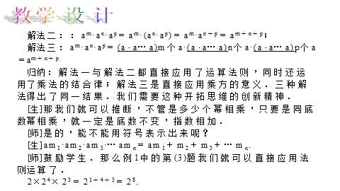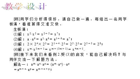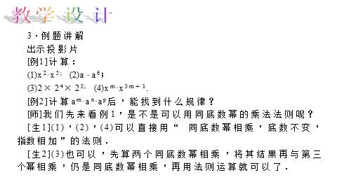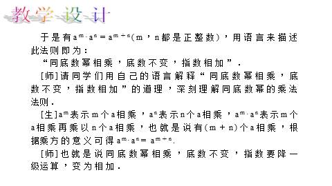 [师]请同学们用自己的语言解释“同底数幂相乘,底数不变,指数相加”的道理,深刻理解同底数幂的乘法法则.
