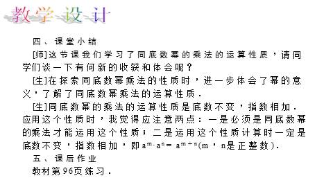 [师]这节课我们学习了同底数幂的乘法的运算性质,请同学们谈一下有何新的收获和体会呢?