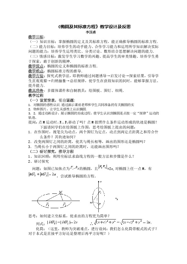 教具准备:多媒体课件和自制教具:绘图板、图钉、细绳.