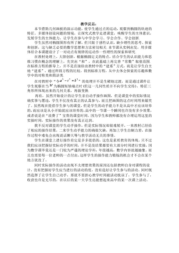 本节借助几何画板的演示功能,使学生通过点的运动,观察到椭圆的轨迹的特征。多媒体创设问题的情境,让探究式教学走进课堂,唤醒学生的主体意识,发展学生的主体能力,让学生在参与中学会学习、学会合作、学会创新.