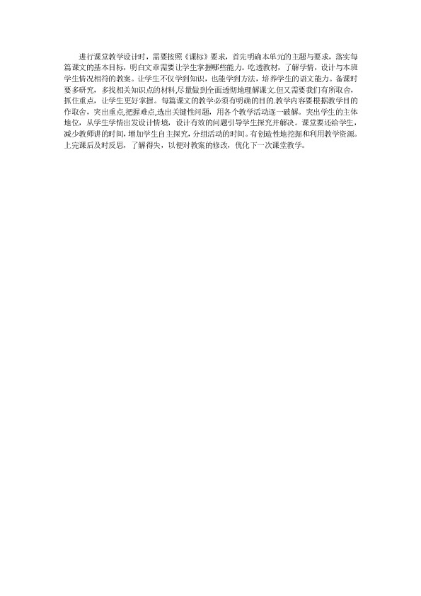 进行课堂教学设计时,需要按照《课标》要求,首先明确本单元的主题与要求,落实每篇课文的基本目标,明白文章需要让学生掌握哪些能力。吃透教材,了解学情,设计与本班学生情况相符的教案。让学生不仅学到知识,也能学到方法,培养学生的语文能力。备课时要多研究,多找相关知识点的材料,尽量做到全面透彻地理解课文.但又需要我们有所取舍,抓住重点,让学生更好掌握。每篇课文的教学必须有明确的目的.教学内容要根据教学目的作取舍,突出重点,把握难点,选出关键性问题,用各个教学活动逐一破解。突出学生的主体地位,从学生学情出发设计情境,设计有效的问题引导学生探究并解决。课堂要还给学生,减少教师讲的时间,增加学生自主探究,分组活动的时间。有创造性地挖掘和利用教学资源。上完课后及时反思,了解得失,以便对教案的修改,优化下一次课堂教学。