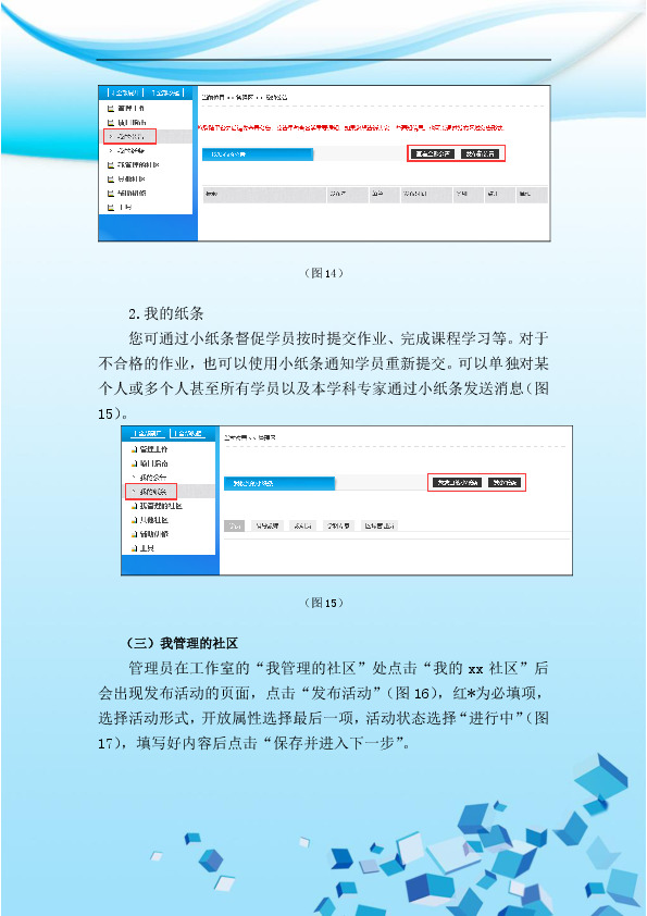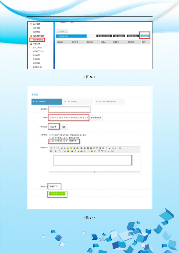 管理员在工作室的“我管理的社区”处点击“我的xx社区”后会出现发布活动的页面,点击“发布活动”(图16),红*为必填项,选择活动形式,开放属性选择最后一项,活动状态选择“进行中”(图17),填写好内容后点击“保存并进入下一步”。