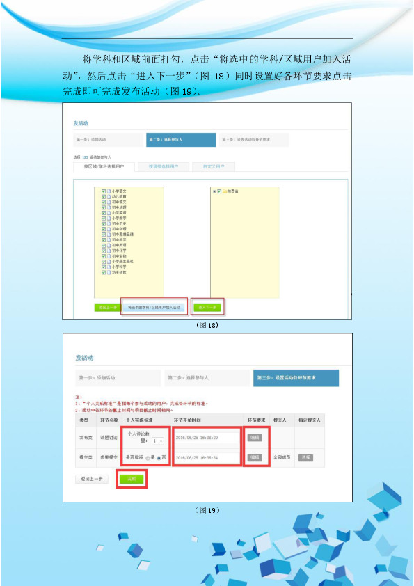 将学科和区域前面打勾,点击“将选中的学科/区域用户加入活动”,然后点击“进入下一步”(图18)同时设置好各环节要求点击完成即可完成发布活动(图19)。