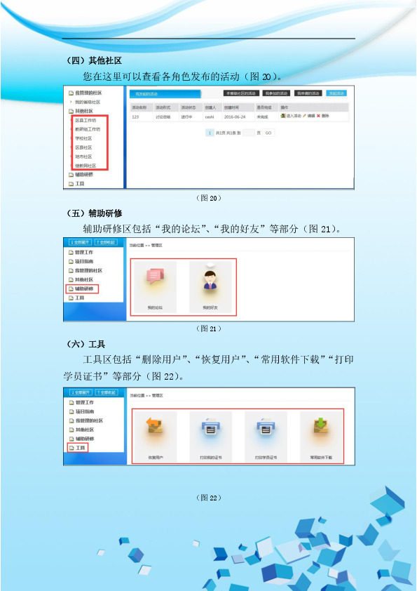 辅助研修区包括“我的论坛”、“我的好友”等部分(图21)。