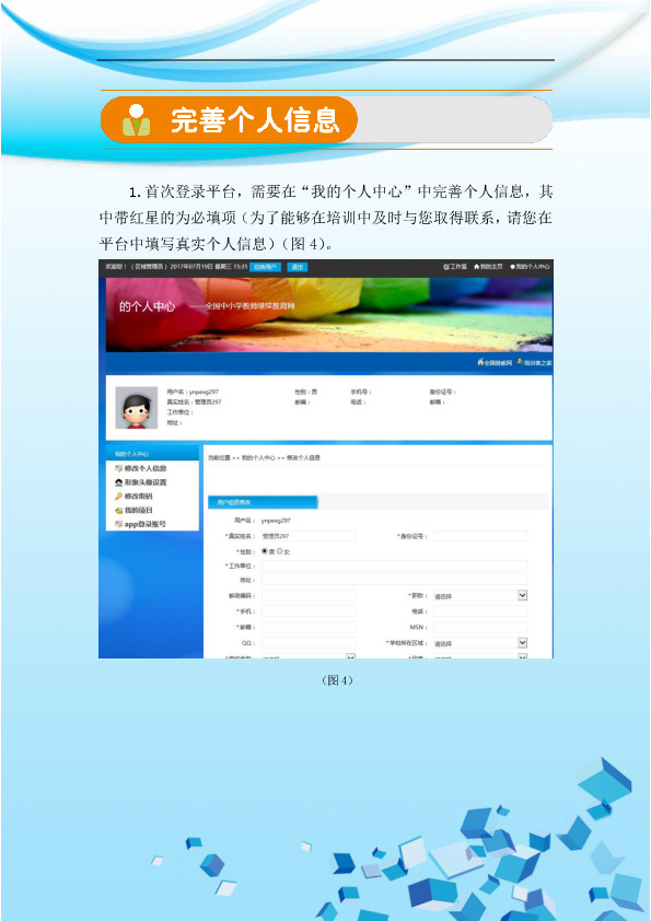 1.首次登录平台,需要在“我的个人中心”中完善个人信息,其中带红星的为必填项(为了能够在培训中及时与您取得联系,请您在平台中填写真实个人信息)(图4)。