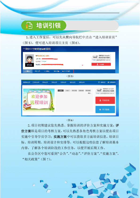 1.进入工作室后,可以先从横向导航栏中点击“进入培训首页”(图5),便可进入培训项目主页(图6)。