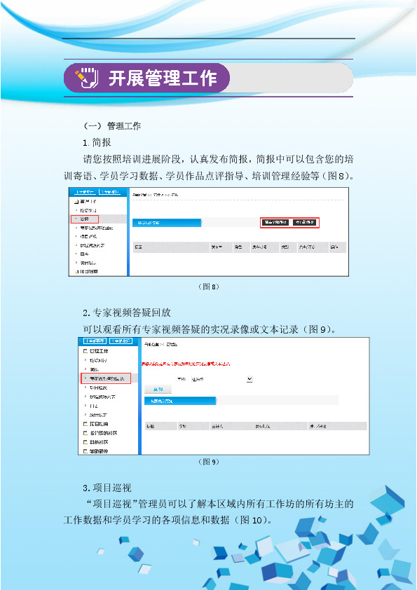 请您按照培训进展阶段,认真发布简报,简报中可以包含您的培训寄语、学员学习数据、学员作品点评指导、培训管理经验等(图8)。