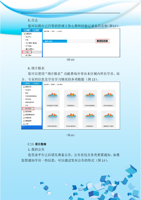 您可以使用“统计报表”功能***有学员、坊主、专家的信息及学员学习情况的各项数据(图13)。