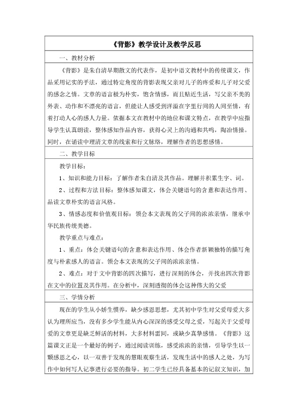 《背影》是朱自清早期散文的代表作,是初中语文教材中的传统课文,作品采用记实的手法,通过特定角度的背影表现父亲对儿子的疼爱和儿子对父爱的感念之情。文章的语言极为朴实,饱含情感,而且贴近生活,写父亲不美的外表、动作和不漂亮的语言,但能让人感受到洋溢在字里行间的人间至情,有着打动人心的感人力量。依据本文在教材中的地位和课文特点,在教学中应指导学生认真朗读,整体感知作品内容,获得心灵上的沟通和共鸣,陶冶情操。同时,在诵读中理清文章的线索和行文脉络,理解作者的思想感情。