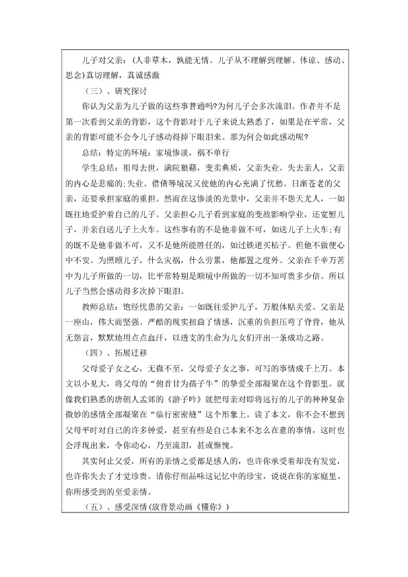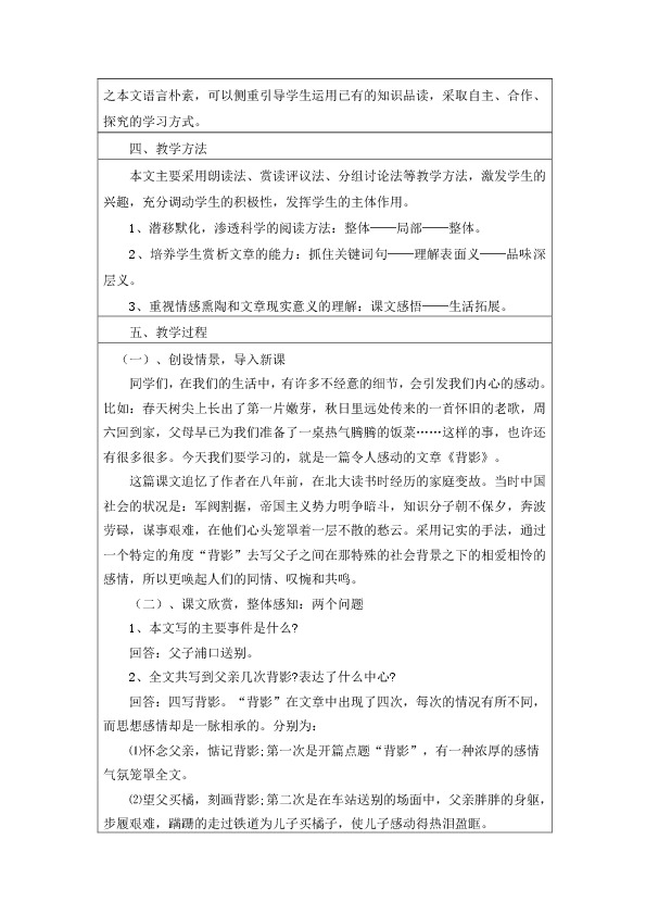 2、难点:对于文中背影的四次描写,进行深刻的体会,并找出四次背影在文中的位置及其作用。在分析中,深刻透彻的体会这种伟大的父爱