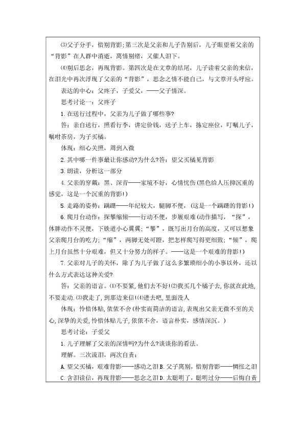 教师总结:饱经忧患的父亲:一如既往爱护儿子,万般体贴关爱。父亲是一座山,伟大而坚强。严酷的现实扭曲了情感,沉重的负担压弯了脊背,他从无怨言,默默地用点点血汗,以透支的生命为儿女们开出一条成功之路。