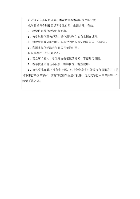 3、有些学生在课上没有参与感,小组合作发言时好像与自己无关,由于我不想打断授课节奏,没有对这些学生进行批评,这是我感觉本课课后的一个遗憾不足之处。