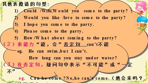 eg. Can he come ?No,he can’t come.(他会来吗?不,他不能来.)