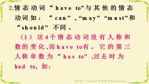 2.情态动词“have to”与其他的情态动词如:“can” , “may” “must”和 “should” 不同。