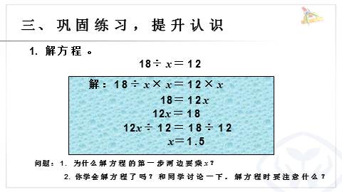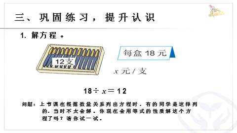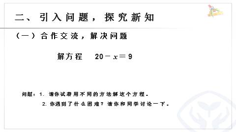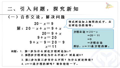 问题:请你运用等式的性质解方程,并具体说说你的想法。