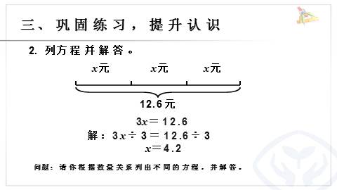 问题:上节课在根据数量关系列出方程时,有的同学是这样列 的,当时不太会解。你现在会用等式的性质解这个方 程了吗?请你试一试。