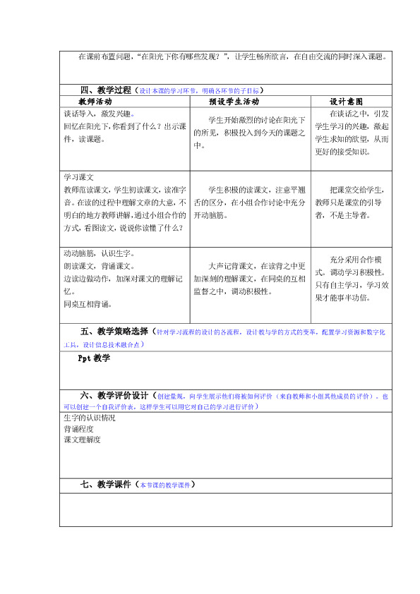 四、教学过程(设计本课的学习环节,明确各环节的子目标)