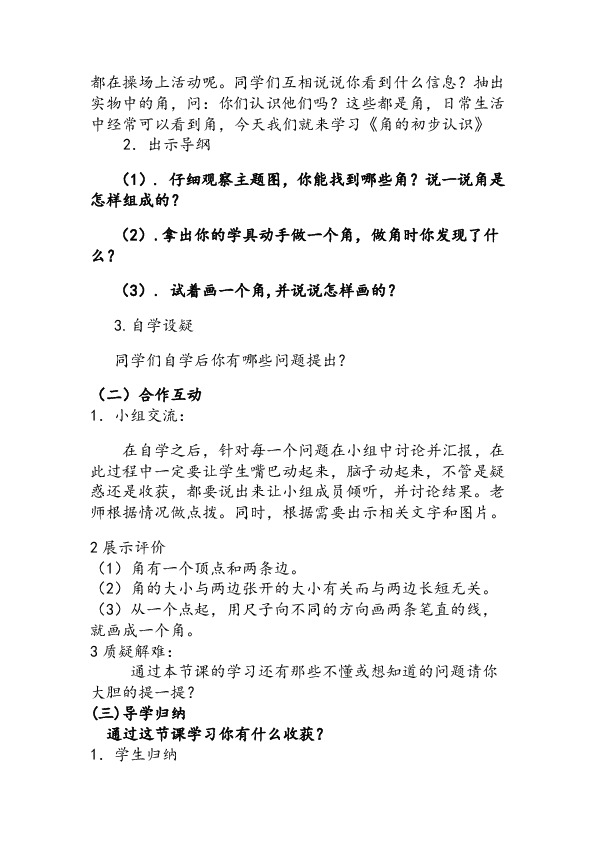 这是学生第一次系统地学习角的知识,学生在生活中已有一些零散的关于平面图形角的知识和经验。但对于抽象的角的概念,特征,角的大小变化规律的理解仍有一定的困难。