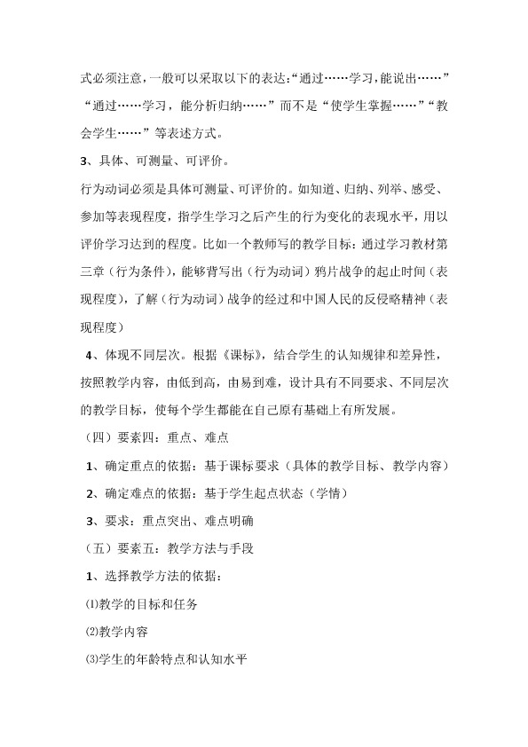 行为动词必须是具体可测量、可评价的。如知道、归纳、列举、感受、参加等表现程度,指学生学习之后产生的行为变化的表现水平,用以评价学习达到的程度。比如一个教师写的教学目标:通过学习教材第三章(行为条件),能够背写出(行为动词)鸦片战争的起止时间(表现程度),了解(行为动词)战争的经过和中国人民的反侵略精神(表现程度)