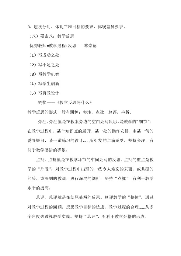 总评。总评就是在结尾处写的反思。总评教学的“整体”,通过对教学过程的回顾,反思教学目标的达成,教学过程的合理......从多个角度去透视教学实践。坚持“总评”,有利于教学分格的形成。