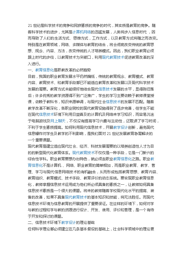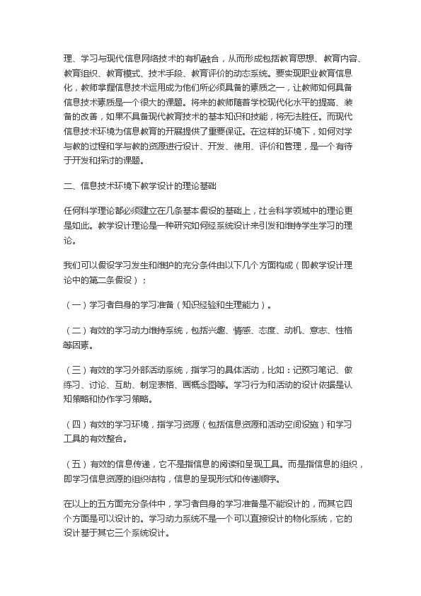 21世纪是科学技术的竞争和民族素质的竞争的时代,其实质是教育的竞争。随着科学技术的进步,尤其是计算机网络的迅猛发展,人类将步入信息时代 ,因而导致了人们的生活方式、思维方式,工作方式,以及教育方式将随之而改变。特别是在教育领域,网络、多媒体与教育的结合,将会彻底改变传统的教育思想、观念、内容、方法,改变传统的人才培养模式。因此,我们职业教育必须跟上时代的步伐,以教育技术为突破口,利用现代教育技术促进教育改革的深入进行。一、教育信息化是职教改革的必然趋势目前,我国的职业教育发展水平仍然偏低,传统的教育观念、教育模式、教育内容、教育技术、和教育手段都已不能适应教育改革和发展以及现代科学技术发展的需要。教育方式未能很好地结合现代信息技术发展的水平,显得陈旧落后;许多优秀的教学资源得不到广泛推广,学生的学习主要依赖于教师课堂授课,依赖于教科书,知识来源单调,与现代社会信息技术的发展不匹配。随着教学改革不断深化,各职业院校的现代教育设施得到了逐步完善,但学生不能在现代信息技术环境下利用日益普及的计算机及网络来学习知识,而容易沉迷于电脑游戏及网上聊天,不仅没有提高学习兴趣与主动性,还耽误了学习时间,不利于学生素质提高。如何利用现代信息技术,开展教学设计创新,避免现代信息爆炸对学生及教学的不利影响,是我们面对21世纪发展教育急需解决的一个重要课题。现代教育是建立适应现代社会、经济、科技发展需要的以培养创造性人才为目的的新型现代化教育体系。现代教育技术不仅仅是一种手段,它是一门新兴的综合性学科。职业教育要想办出特色,就必须走职业教育信息化之路。职业教育信息化不是计算机 、网络、职业教育的简单相加,而是职业教育、教学、管理、学习与现代信息网络技术的有机融合,从而形成包括教育思想、教育内容、教育组织、教育模式、技术手段、教育评价的动态系统。要实现职业教育信息化,教师掌握信息技术运用成为他们所必须具备的素质之一,让教师如何具备信息技术素质是一个很大的课题。将来的教师随着学校现代化水平的提高、装备的改善,如果不具备现代教育技术的基本知识和技能,将无法胜任。而现代信息技术环境为信息教育的开展提供了重要保证。在这样的环境下,如何对学与教的过程和学与教的资源进行设计、开发、使用、评价和管理,是一个有待于开发和探讨的课题。二、信息技术环境下教学设计的理论基础任何科学理论都必须建立在几条基本假设的基础上,社会科学领域中的理论更是如此。教学设计理论是一种研究如何经系统设计来引发和维持学生学习的理论。我们可以假设学习发生和维护的充分条件由以下几个方面构成(即教学设计理论中的第二条假设);(一)学习者自身的学习准备(知识经验和生理能力)。(二)有效的学习动力维持系统,包括兴趣、情感、态度、动机、意志、性格等因素。(三)有效的学习外部活动系统,指学习的具体活动,比如:记预习笔记、做练习、讨论、互助、制定表格、画概念图等。学习行为和活动的设计依据是认知策略和协作学习策略。(四)有效的学习环境,指学习资源(包括信息资源和活动空间设施)和学习工具的有效整合。(五)有效的信息传递,它不是指信息的阅读和呈现工具。而是指信息的组织,即学习信息资源的组织结构,信息的呈现形式和传递顺序。在以上的五方面充分条件中,学习者自身的学习准备是不能设计的,而其它四个方面是可以设计的。学习动力系统不是一个可以直接设计的物化系统,它的设计基于其它三个系统设计。教学设计的设计对象有三(教学设计理论中的第三条假设):1、学习活动的设计。按照建构主义思想,学习者学习和发展的动力来源与学习者与环境的相互作用。学习者认知技能的发展、情感态度的变化都应归因于这种相互作用。站在学习者的角度看,这种相互作用便是学习活动。因此,学习活动的设计必须作为教学设计的核心内容来看待。学习活动的设计最终表现为学习任务的设计,通过规定学习者所要完成的任务目标、成果形式、活动内容、活动策略和方法来引发学习者学习内部的认识加工和思维,从而达到发展学习者心理机能的目的。2、学习环境的设计。从设计者的角度看,学习环境是学习资源(特指媒体资源)和学习工具的组合,这种组合实际上是旨在实现某种目标的有机整合。在学习活动发生时,学习环境又被称为学习情景,其中必然包含人际关系要素。学习环境的设计主要表现为学习资源和学习工具的整合活动。在设计时也应考虑人际支持的实施方案,但人际支持通常表现为一种观念而不是具有严格操作步骤的实施法则。3、媒体传递的设计。媒体传递设计的任务是决定通过何种媒体形式,按照何种呈现顺序,以什么样的组织形式向学习者传递信息。课堂讲授的设计及教学媒体材料的设计和开发就属于这个层面的活动。媒体传递是最边缘层次的设计活动。以上将教学设计活动划分为三个层面,旨在提醒教学设计者学习环境和媒体的设计并不是教学设计的全部。在很长一段时间,教学设计领域主要是集中在媒体传递层面上的活动。随着网络的普及,网络环境的开放性,资源的丰富性,资源的易获取性等特征使教学设计者将设计