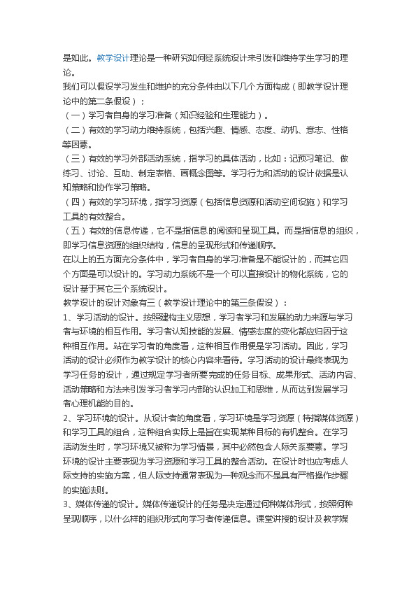 任何科学理论都必须建立在几条基本假设的基础上,社会科学领域中的理论更是如此。教学设计理论是一种研究如何经系统设计来引发和维持学生学习的理论。