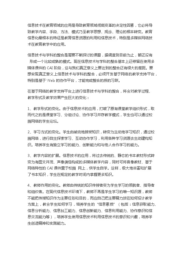 3、教学内容的扩展。信息技术的应用,将过去传统的、静态的书本教材形式转变为有图文并茂、声像俱佳构成的多媒体教学内容,同时可将音像教材、基于网络特性的CAI课件置于校园 ?网上,供学生自学。这样,极大地丰富和扩展了书本知识,学生在规定的教学时间内掌握更多知识。