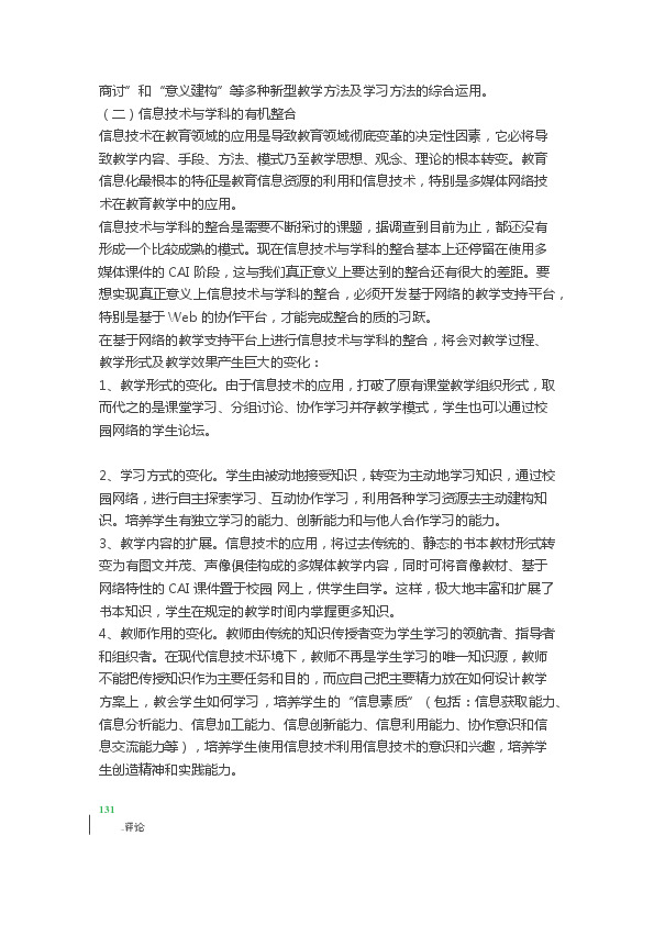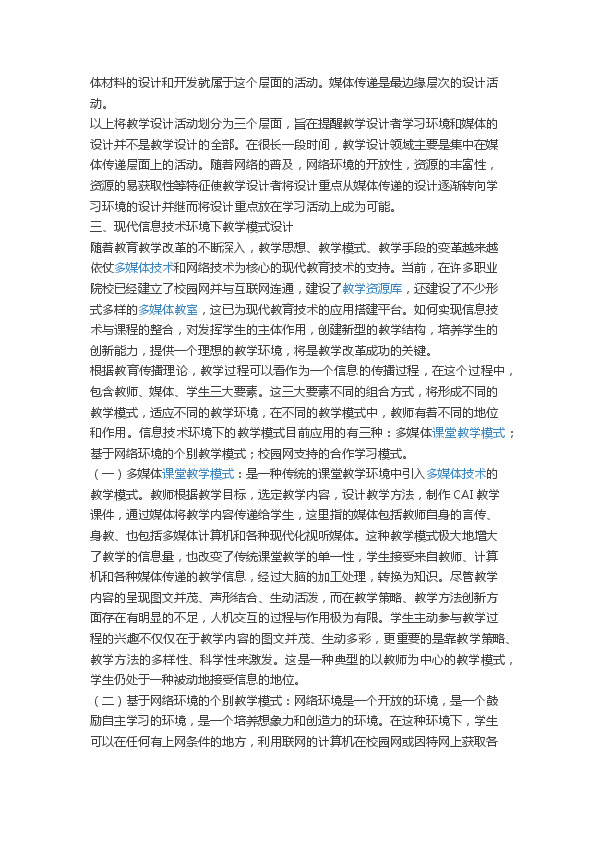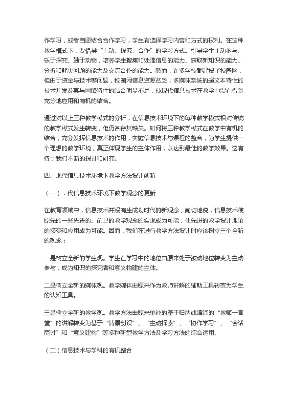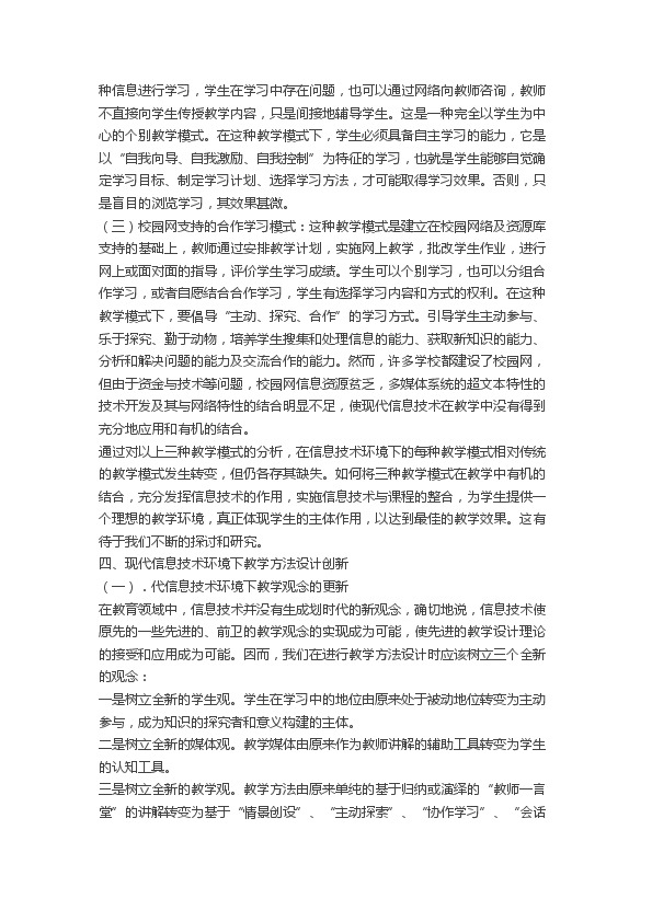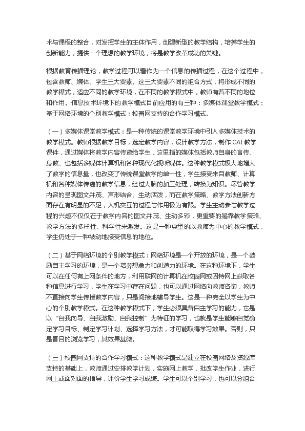 (二)基于网络环境的个别教学模式:网络环境是一个开放的环境,是一个鼓励自主学习的环境,是一个培养想象力和创造力的环境。在这种环境下,学生可以在任何有上网条件的地方,利用联网的计算机在校园网或因特网上获取各种信息进行学习,学生在学习中存在问题,也可以通过网络向教师咨询,教师不直接向学生传授教学内容,只是间接地辅导学生。这是一种完全以学生为中心的个别教学模式。在这种教学模式下,学生必须具备自主学习的能力,它是以“自我向导、自我激励、自我控制”为特征的学习,也就是 >>>>>>内容过长,仅展示头部和尾部部分文字预览,全文请查看图片预览。<<<<<< 组织形式,取而代之的是课堂学习、分组讨论、协作学习并存教学模式,学生也可以通过校园网络的学生论坛。