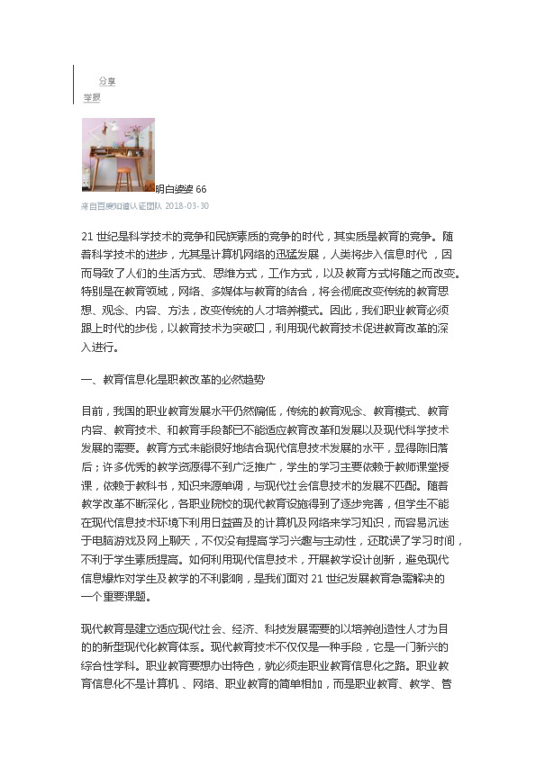 21世纪是科学技术的竞争和民族素质的竞争的时代,其实质是教育的竞争。随着科学技术的进步,尤其是计算机网络的迅猛发展,人类将步入信息时代 ,因而导致了人们的生活方式、思维方式,工作方式,以及教育方式将随之而改变。特别是在教育领域,网络、多媒体与教育的结合,将会彻底改变传统的教育思想、观念、内容、方法,改变传统的人才培养模式。因此,我们职业教育必须跟上时代的步伐,以教育技术为突破口,利用现代教育技术促进教育改革的深入进行。