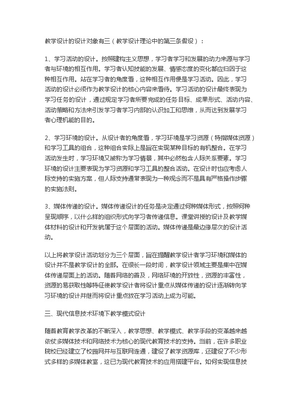 以上将教学设计活动划分为三个层面,旨在提醒教学设计者学习环境和媒体的设计并不是教学设计的全部。在很长一段时间,教学设计领域主要是集中在媒体传递层面上的活动。随着网络的普及,网络环境的开放性,资源的丰富性,资源的易获取性等特征使教学设计者将设计重点从媒体传递的设计逐渐转向学习环境的设计并继而将设计重点放在学习活动上成为可能。