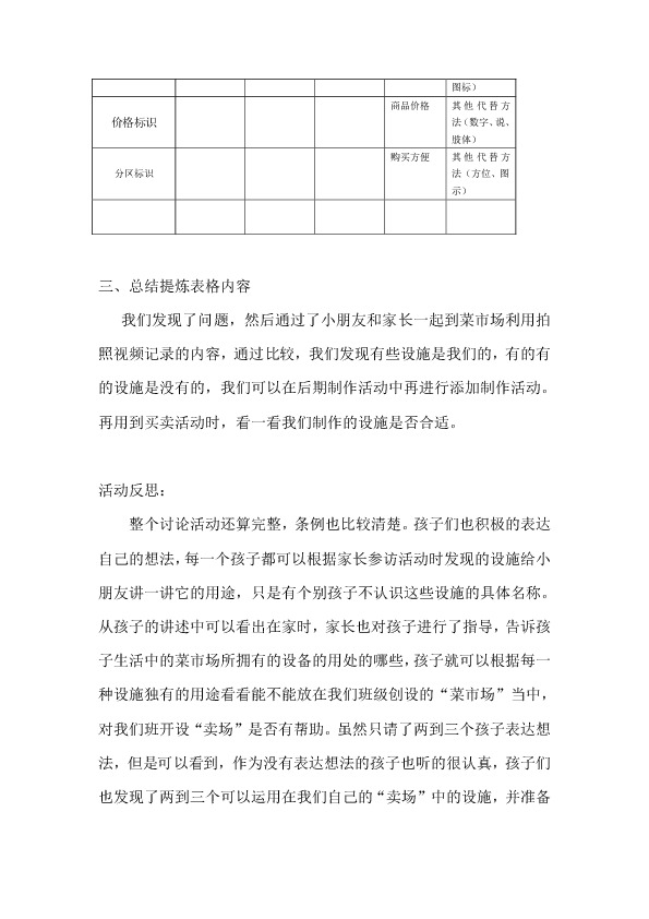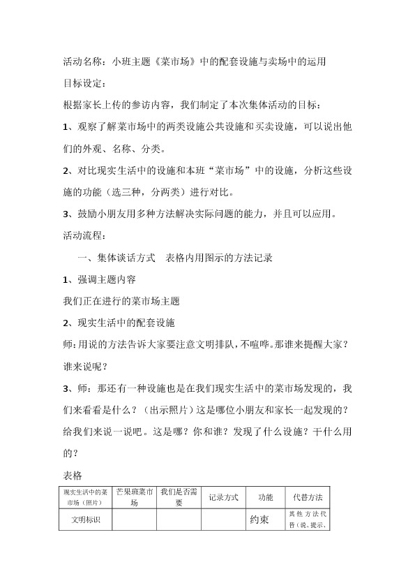 本次的讨论活动是为了讨论出菜市场中的哪些设备在我们的“卖场”还没有出现,然后发现适合我们的“菜市场”的设施,并把这样的设备做出来,放在我们的卖场中,利用表格分类出的设施,然后可以用特殊标记标出之后的制作活动要做的设施的东西上,作为后面制作活动的计划,总体来说都是在为完善我们自己的“菜市场”做准备。