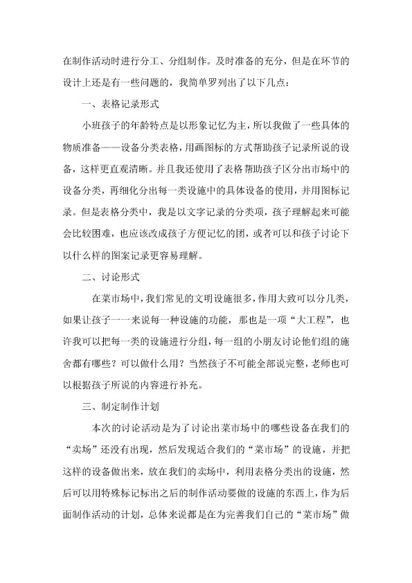 整个讨论活动还算完整,条例也比较清楚。孩子们也积极的表达自己的想法,每一个孩子都可以根据家长参访活动时发现的设施给小朋友讲一讲它的用途,只是有个别孩子不认识这些设施的具体名称。从孩子的讲述中可以看出在家时,家长也对孩子进行了指导,告诉孩子生活中的菜市场所拥有的设备的用处的哪些,孩子就可以根据每一种设施独有的用途看看能不能放在我们班级创设的“菜市场”当中,对我们班开设“卖场”是否有帮助。虽然只请了两到三个孩子表达想法,但是可以看到,作为没有表达想法的孩子也听的很认真,孩子们也发现了两到三个可以运用在我们自己的“卖场”中的设施,并准备在制作活动时进行分工、分组制作。及时准备的充分,但是在环节的设计上还是有一些问题的,我简单罗列出了以下几点: