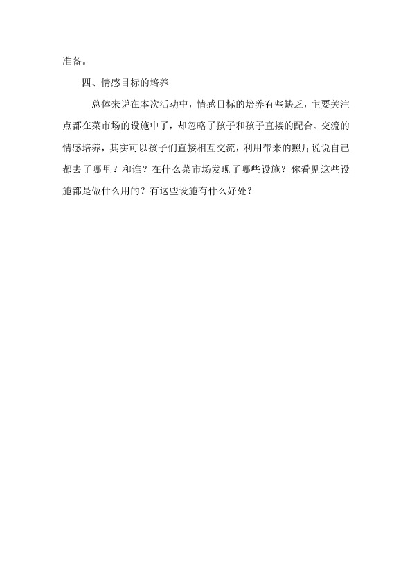 总体来说在本次活动中,情感目标的培养有些缺乏,主要***了,却忽略了孩子和孩子直接的配合、交流的情感培养,其实可以孩子们直接相互交流,利用带来的照片说说自己都去了哪里?和谁?在什么菜市场发现了哪些设施?你看见这些设施都是做什么用的?有这些设施有什么好处?