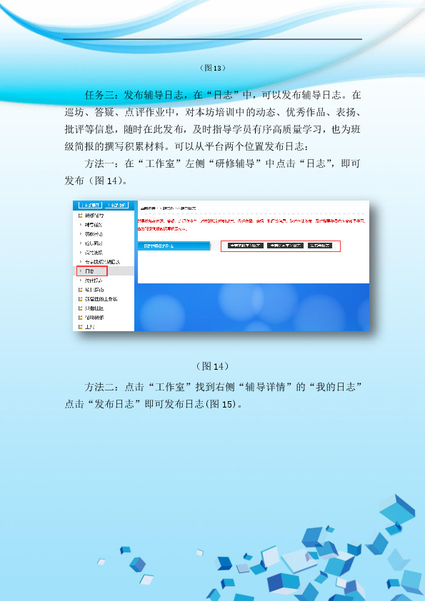 方法一:在“工作室”左侧“研修辅导”中点击“日志”,即可发布(图14)。