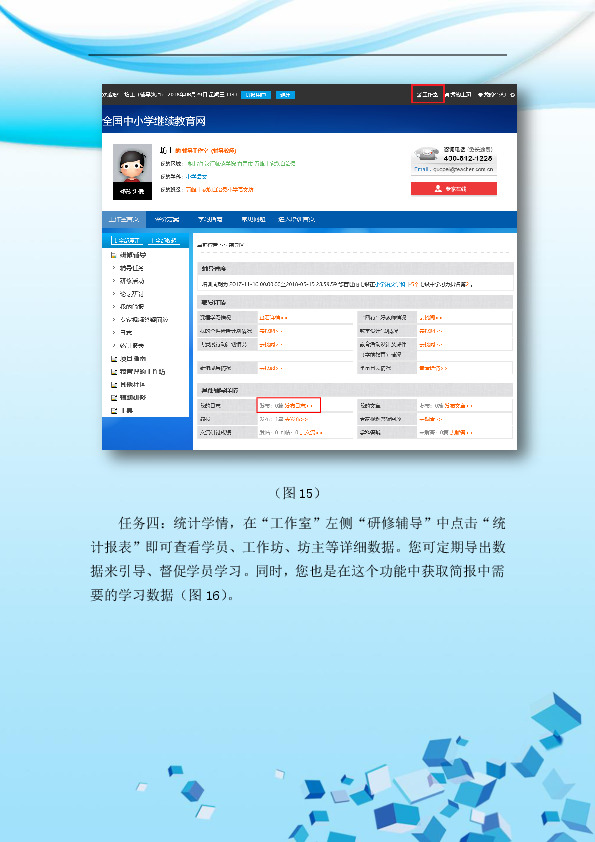 任务四:统计学情,在“工作室”左侧“研修辅导”中点击“统计报表”即可查看学员、工作坊、坊主等详细数据。您可定期导出数据来引导、督促学员学习。同时,您也是在这个功能中获取简报中需要的学习数据(图16)。