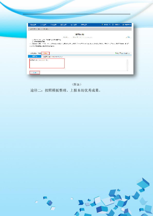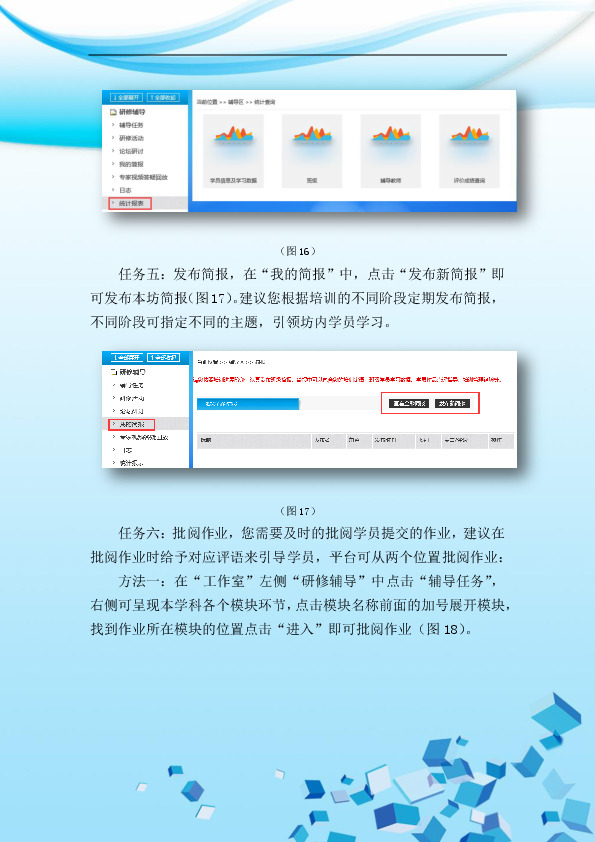 任务五:发布简报,在“我的简报”中,点击“发布新简报”即可发布本坊简报(图17)。建议您根据培训的不同阶段定期发布简报,不同阶段可指定不同的主题,引领坊内学员学习。
