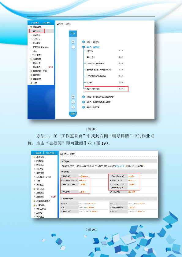 方法二:在“工作室首页”中找到右侧“辅导详情”中的作业名称,点击“去批阅”即可批阅作业(图19)。