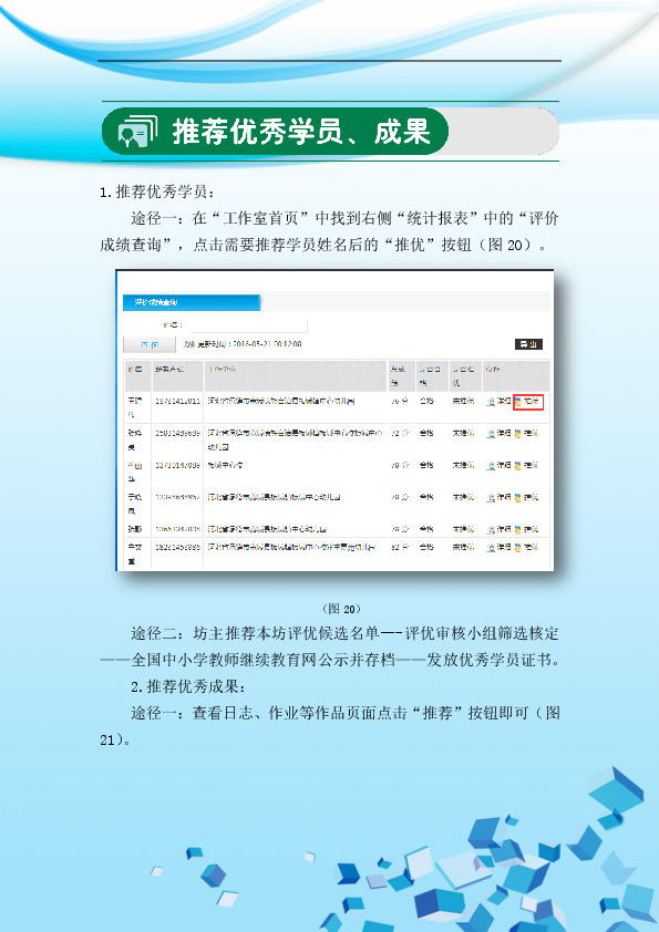 途径一:在“工作室首页”中找到右侧“统计报表”中的“评价成绩查询”,点击需要推荐学员姓名后的“推优”按钮(图20)。