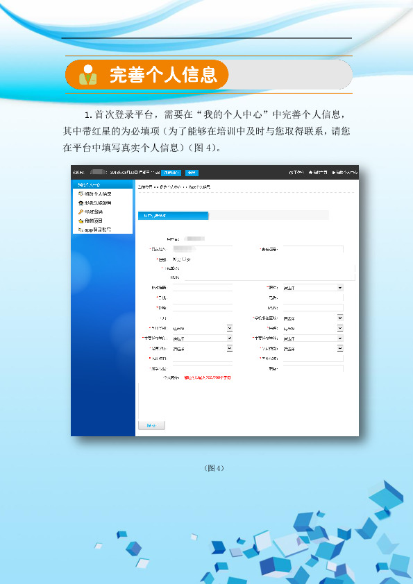 1.首次登录平台,需要在“我的个人中心”中完善个人信息,其中带红星的为必填项(为了能够在培训中及时与您取得联系,请您在平台中填写真实个人信息)(图4)。