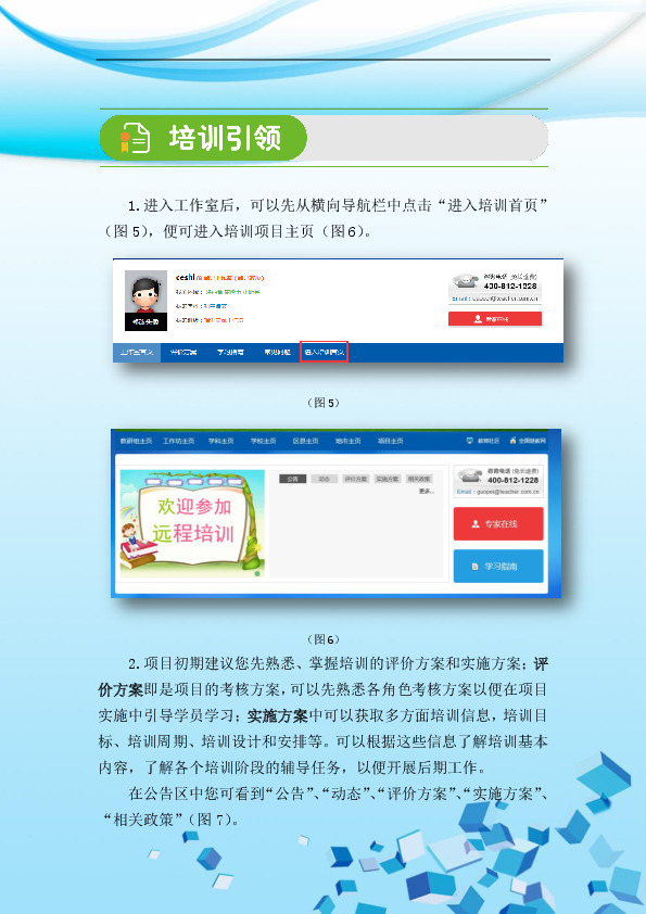 1.进入工作室后,可以先从横向导航栏中点击“进入培训首页”(图5),便可进入培训项目主页(图6)。