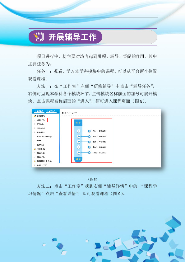 方法一:在“工作室”左侧“研修辅导”中点击“辅导任务”,右侧可呈现本学科各个模块环节,点击模块名称前面的加号可展开模块。点击课程名称后面的“进入”,便可进入课程页面(图8)。