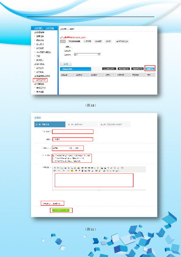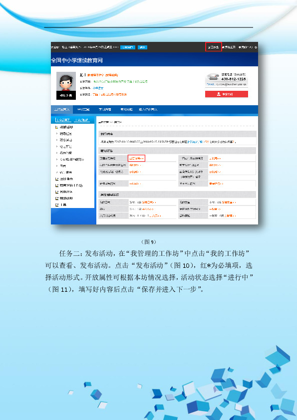 任务二:发布活动,在“我管理的工作坊”中点击“我的工作坊”可以查看、发布活动。点击“发布活动”(图10),红*为必填项,选择活动形式。开放属性可根据本坊情况选择,活动状态选择“进行中”(图11),填写好内容后点击“保存并进入下一步”。