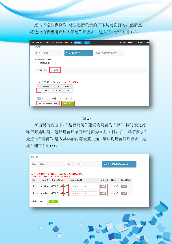 点击“添加班级”,将自己所负责的工作坊前面打勾,然后点击“将选中的班级用户加入活动”后点击“进入下一步”(图12)。