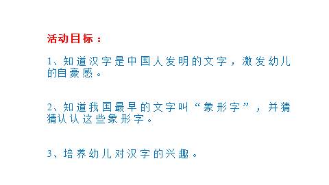 1、知道汉字是中国人发明的文字,激发幼儿的自豪感。