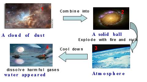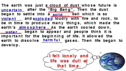 The earth was just a cloud of dust whose future is _________ after the “Big Bang”. Then the dust began to settle into a _______ ball which is so ________ and _______ loudly with fire and rock, to be in time to produce many things, which made the earth’s ___________. As the earth cooled down, ________ began to appear and people think it is important for the beginning of life. It allowed the earth to dissolve ________ gases. Then life began to develop.