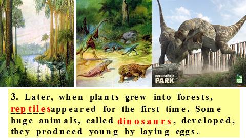 3. Later, when plants grew into forests, ______ appeared for the first time. Some huge animals, called _________, developed, they produced young by laying eggs.