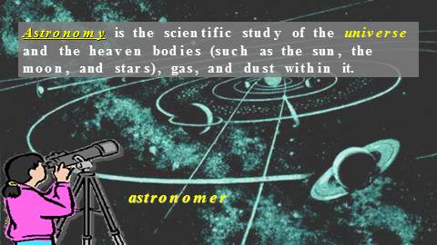 Astronomy is the scientific study of the universe and the heaven bodies (such as the sun, the moon, and stars), gas, and dust within it.