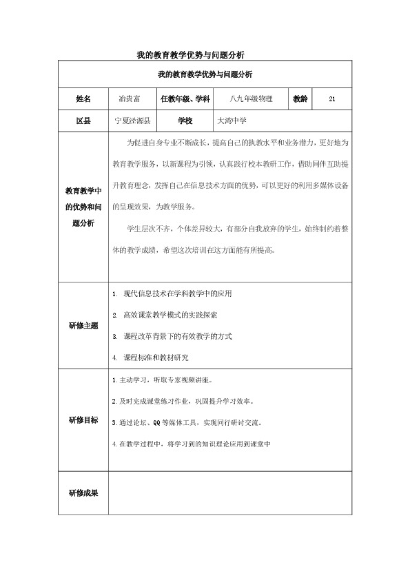 学生层次不齐,个体差异较大,有部分自我放弃的学生,始终制约着整体的教学成绩,希望这次培训在这方面能有所提高。